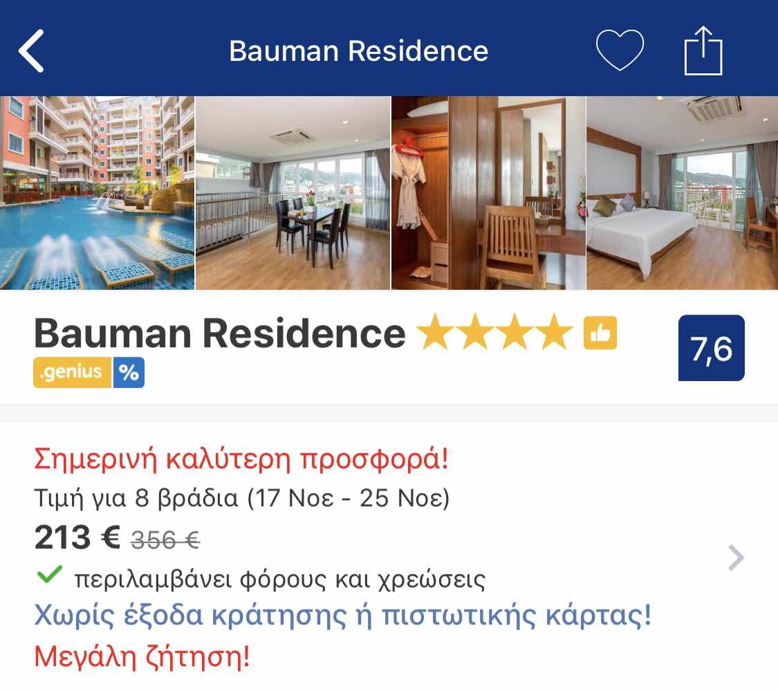 Άλλη μια καλή επιλογή είναι και το 4* Buaman Residence το οποίο διαθέτει πισίνα και βρίσκεται επισης στο κεντρο της Patong, μόλις 10 λεπτά με τα πόδια από την παραλία και την νυχτερινή ζωή της πολης. Όλα τα δωμάτια περιλαμβάνουν δορυφορική τηλεόραση επίπεδης οθόνης και ιδιωτικό μπάνιο με ντους. Η τιμή του για 8 βραδια είναι στα 213€ για ένα δίκλινο δωμάτιο.
