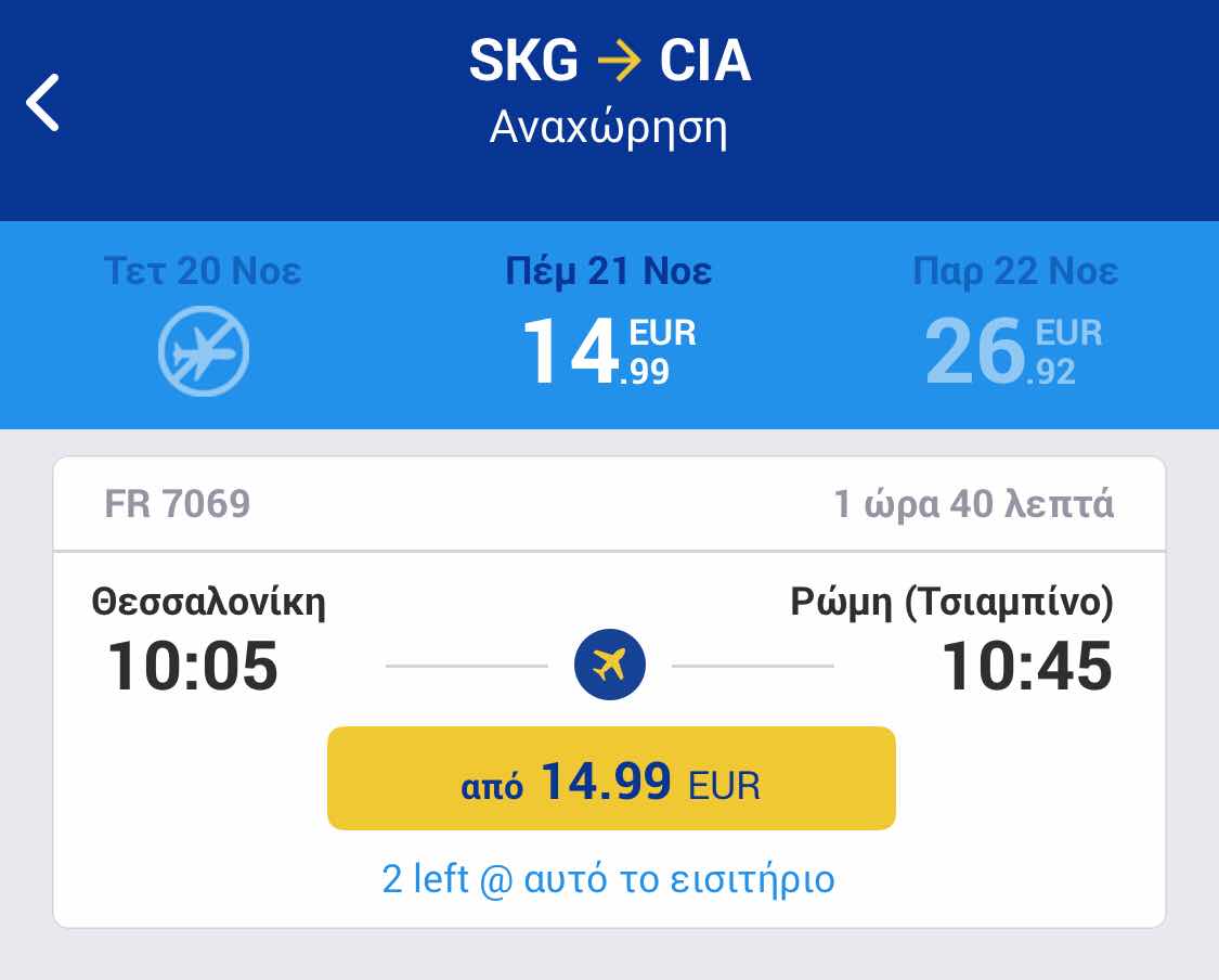 Θεσσαλονίκη - Ρώμη 21/11 - 10:05